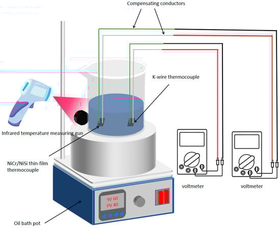 A static calibration experiment (Chen, 2018 [12]; Wang et al., 2021 [13]; Ma et al., 2014 [14]) is carried out in this paper. The experiment mainly consists of the following instruments and equipment: NiCr/NiSi thin-film thermocouple, K-type wire thermocouple, K-type compensation wire, oil bath pot, beaker, C400 infrared temperature measuring gun, voltmeter, 250-30CS phenyl high-temperature heat transfer oil, etc. The schematic diagram of the experiment is shown in Figure 5. In this experiment, the hot end of the thermocouple is the high-temperature heat transfer oil, the cold end is room temperature, and the temperature range is 20–350 °C.