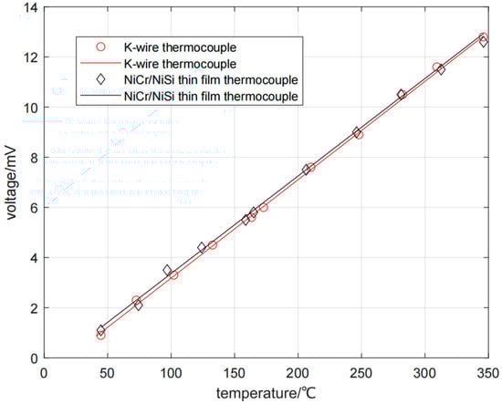 Fitting curves of K-type wire thermocouple and NiCr/NiSi thin-film thermocouple.