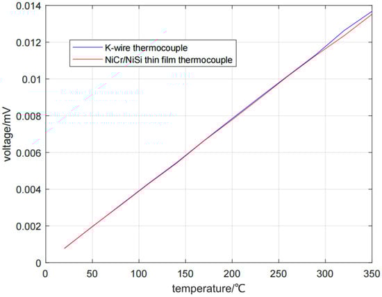 By repeatedly measuring the voltage output at different temperature differences, the temperature–voltage output curve is obtained in Figure 8. The Zeebek coefficients of NiCr/NiSi thin-film thermocouple and K-wire thermocouple were measured at different temperature differences. When the temperature differences are 20, 50, 80, 110, 140, 170, 200, 230, 260, 290, 320, and 350 °C, the Zeebek coefficients of NiCr/NiSi thin-film thermocouple are 38.66, 39.31, 38.90, 38.94, 38.60, 39.06, 38.88, 38.96, 39.09, 38.92, 38.58, 38.64μV/°C, and the Zeebek coefficients of K-wire thermocouple are 38.78, 39.22, 39.08, 39.10, 38.77, 39.13, 39.20, 39.21, 39.17, 39.06, 39.46, and 39.10 μV/°C. The NiCr/NiSi thin-film thermocouple has good stability.