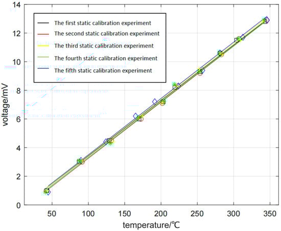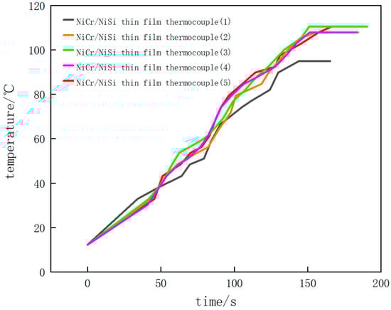 Figure 11 and Figure 12 show the results of the temperature measurement experiments. Figure 11 shows the experimental results of the K-wire thermocouple in five experiments with different colors. Figure 12 shows the experimental results of NiCr/NiSi thin-film thermocouple in five experiments.