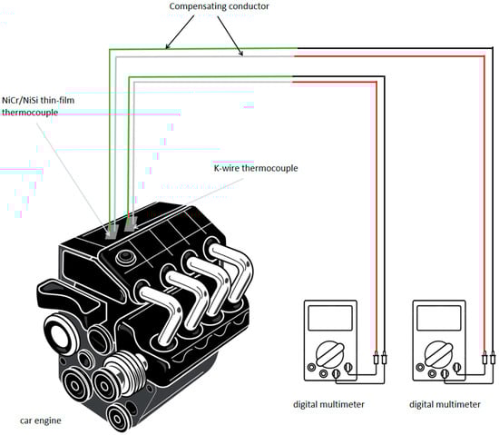 The temperature measurement experiment mainly consists of the following instruments and equipment: NiCr/NiSi thin-film thermocouple, K-type wire thermocouple, K-type compensation wire, DT9205A digital multimeter (ANRECSON, Shenzhen, China), automobile engine, stopwatch, etc. The schematic diagram of the experiment is shown in Figure 10. According to the performance of the automobile engine, the temperature can be measured in the range of about 20–120 °C.