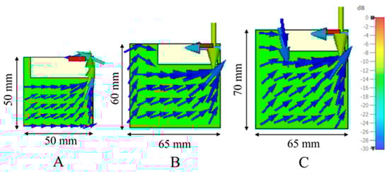 Figure 1. Three PCB sizes on a 1 mm thick FR4 substrate (εr = 4.15, tanδ = 0.02): 50 mm × 50 mm (PCB (A)), 60 mm × 65 mm (PCB (B)), and 70 mm × 65 mm (PCB (C)). Each PCB has a 15 mm × 45 mm clearance area and a 12 mm × 3 mm × 2.4 mm antenna booster placed at the top right corner. Current distributions are shown at 900 MHz.