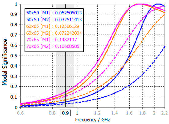 Figure 3. Modal significance of the 1st (M1) and 2nd modes (M2) for different PCB sizes. The grey area represents the 824–960 MHz frequency region.