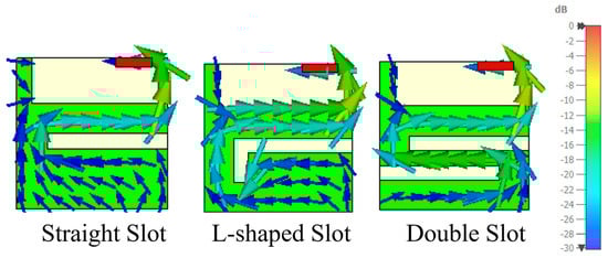 Figure 4. Three slot configurations: straight slot, L-shaped slot, and double slot. Currents are simulated with the same dynamic range and normalised to the same maximum. Current distribution is shown at 900 MHz.