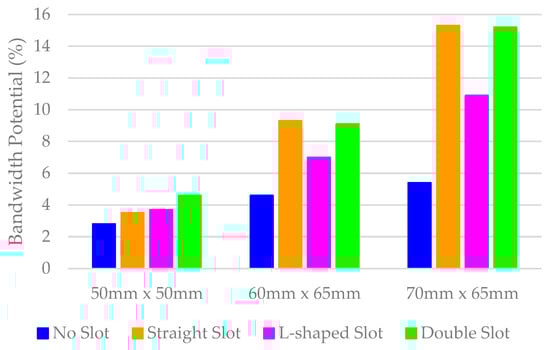 The straight-slot configuration is not the only solution. Other configurations, such as the L-shape and double slot, can be used to increase the current path, further improving the bandwidth potential (Figure 5). The analysis of the bandwidth potential shows two different behaviours. The addition of the slot significantly increases bandwidth, with an improvement of up to 2 times for PCB B, increasing from 4.6% to 9.3%, and 2.8 times for PCB C, increasing from 5.4% to 15.3%. However, for PCB A, the improvement is more modest, rising from 2.8% with no slot ground plane to 4.6% with the double slot configuration.