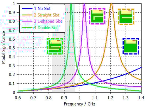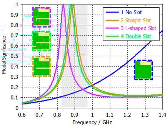 Figure 6. Modal significance of the fundamental mode for 50 mm × 50 mm PCB without and with slots. The grey area represents the 824–960 MHz frequency region.