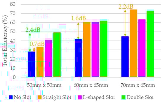 The simulation of a straight slot on the 60 mm × 60 mm ground plane (orange) shows a notable improvement in total efficiency compared to the ground plane without a slot (blue), achieving efficiencies of 60% and 35%, respectively (Figure 12). This improvement represents a significant increase of 2.3 dB over the frequency range of interest. Such an increase in efficiency is attributed to the inclusion of the slot, demonstrating that modifying the ground plane geometry has a substantial positive effect on antenna performance.