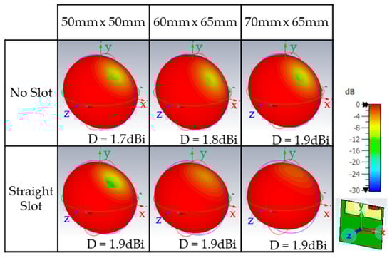To further analyse the effect of the proposed slot configurations, Figure 9 shows the 3D radiation patterns for each configuration. These patterns show a quasi-isotropic radiation pattern with a directivity of approximately 2 dBi, which is advantageous for IoT devices. In IoT communications, the direction of the incoming signal and the orientation of the device are typically random, making this radiation pattern highly suitable for such applications.