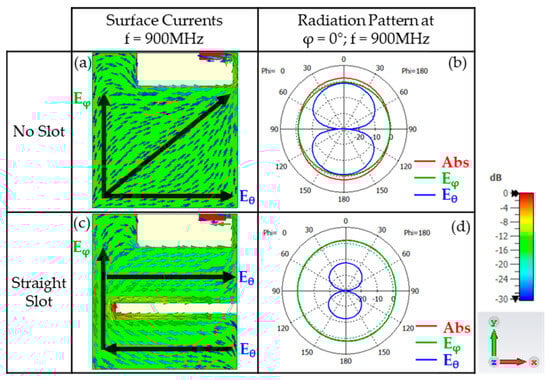 Figure 10. Simulated surface currents and radiation pattern at φ = 0° for an antenna at 900 MHz with a 70 mm × 65 mm PCB, comparing the no-slot and straight-slot configurations. For current distributions, the black arrows have intentionally added to highlight the main current contribution. For (a), the net current is mainly tilted 45° resulting in the radiation pattern at (b). For (c), the main current distribution is vertical (y-axis) resulting in a omnidirectional radiation pattern represented by Eϕ (d); Eθ is due to the contribution of the horizontal currents resulting in a Eθ field with less amplitude than Eϕ since the horizontal currents are out-of-phase and electrically close.