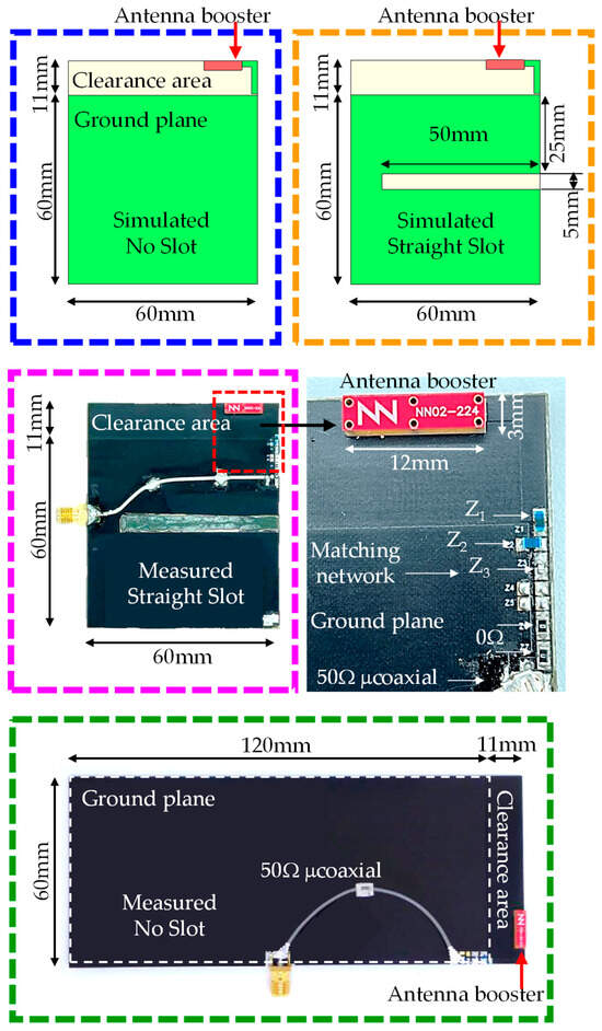 Figure 11. Simulated and measured PCBs, including a 12 mm × 3 mm × 2.4 mm (height) antenna booster. Both simulated cases and prototypes include a thin 1 mm thick substrate, εr = 4.15, tanδ = 0.02. For the prototypes, the matching network is included in the top right corner of the ground plane, including a 50 Ω micro coaxial line ending with an SMA connector for testing S11 and efficiency. Colours for each case are linked with the data shown in Figure 12.