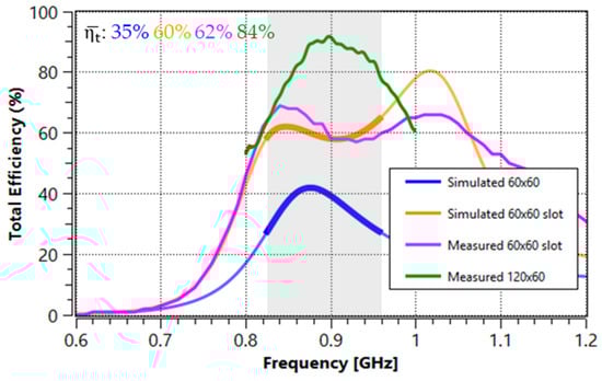 Figure 12. Total efficiency results obtained from the PCBs in Figure 11. The average total efficiency from 824 MHz to 960 MHz is included in the numbers. The grey area represents the 824-960 MHz frequency region. Labels in the legend indicate the size of the ground plane.