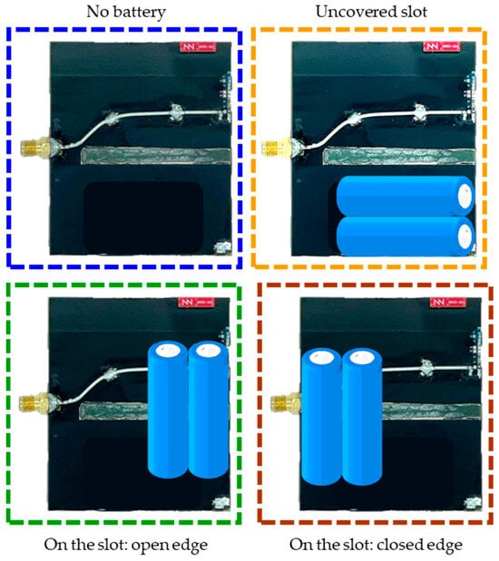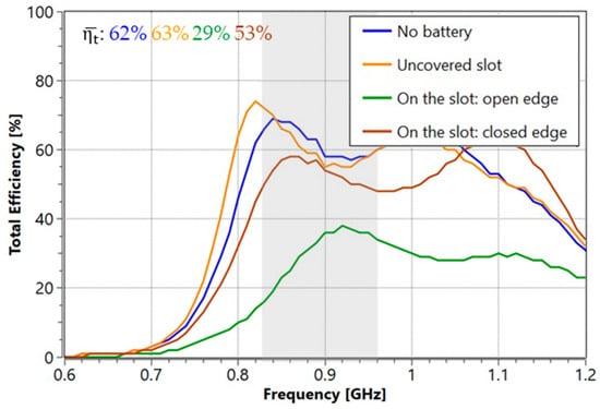 Subsequently, measurements were performed on a slotted configuration applied to a 60 mm × 60 mm ground plane operating in the 824 MHz–960 MHz band, incorporating a battery on the PCB and assessing its impact on total efficiency.