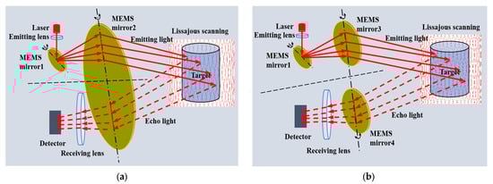 (a) Semi-coaxial design with an ultra-large-aperture MEMS mirror; (b) Semi-coaxial design with two synchronous MEMS mirrors.