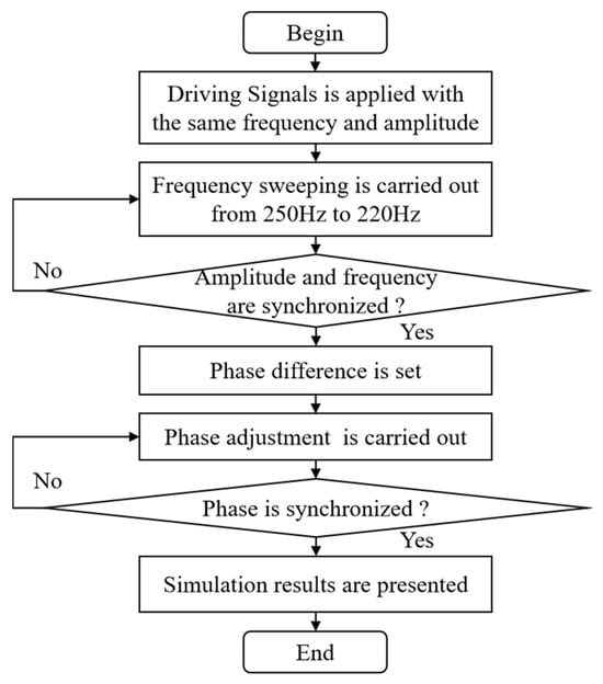 From the Bode plots of the two electromagnetic MEMS mirrors, it can be seen that there are differences in their amplitude-frequency and phase-frequency characteristics. To achieve a synchronous motion for the two MEMS mirrors, it is necessary to synchronize their motion frequency, amplitude, and phase. The simulation process for the synchronous motion is shown in Figure 4. At first, two sine drive signals with the same frequency and amplitude are applied to the two MEMS mirrors. Secondly, a frequency sweep from 250 Hz to 220 Hz is carried out to change the driving torque of the MEMS mirror. Thirdly, real-time monitoring is conducted to ascertain whether the motion frequency and amplitude of the two electromagnetic MEMS mirrors have achieved synchronization. Fourthly, to simulate the motion phase difference between the two MEMS mirrors, a certain phase difference is set for the drive signals. Next, a phase adjustment of the driving signal is carried out and real-time monitoring is conducted to ascertain whether the motion phase of the two electromagnetic MEMS mirrors has achieved synchronization. Finally, the simulation results are presented.
