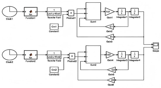 According to Equation (10), the entire simulation process for the synchronous motion of the two electromagnetic MEMS mirrors is conducted in the MATLAB R2014a Simulink as shown in Figure 5. The upper part of the simulation block diagram constructs the motion model of the MEMS mirror , and the lower part for the MEMS mirror . In the simulation model, the driving signals for the two MEMS mirrors are generated by a custom function. As shown in Figure 5, Function1 and Function2 are used to generate the driving signals for MEMS mirrors and . Moreover, the frequency of the driving signal is varied from 250 Hz to 220 Hz to achieve a frequency sweep. The initial phase of the two driving signals is set to 0 and 90, respectively, to simulate the phase difference in the motion of the two MEMS mirrors. Transfer Fcn1 and Transfer Fcn2 are used to construct the transfer function for the driving torque. Characteristic parameters , , , , , and of the two MEMS mirrors can be obtained from Table 1. The different motion states of the two electromagnetic MEMS mirrors can be observed in real time by the scope module.