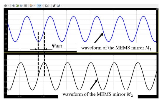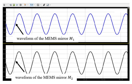 Figure 6 shows the simulation results of the initial motion states of the two electromagnetic MEMS mirrors. As can be seen, the two electromagnetic MEMS mirrors have the same motion frequency and amplitude, but there is a difference in motion phase, which means the motion characteristics of the electromagnetic MEMS mirrors are consistent with the characteristics of their driving signals.
