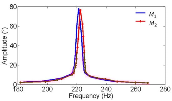 When the MEMS mirror moves at a small angle, the torsional resonance system formed by the motion can be considered linear. The response of an ideal linear system to a nonlinear excitation can be thought of as a superposition of all the frequency responses that make up the excitation wave []. When the MEMS mirror is subjected to a sinusoidal excitation, the torque it experiences can be represented by Equation (2), its response amplitude can be expressed as Equation (3), and its response phase can be expressed as Equation (4).