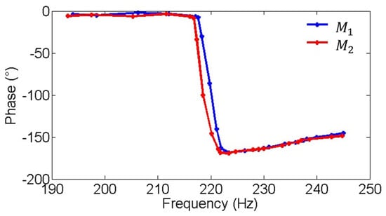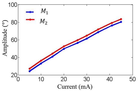 Figure 9 and Figure 10 show the amplitude-frequency and phase-frequency characteristics of the two electromagnetic MEMS mirrors. It can be observed that the two MEMS mirrors demonstrate highly consistent amplitude-frequency characteristics, with both achieving their peak amplitude at approximately 220 Hz. Additionally, a phase difference exists between the two MEMS mirrors at the resonant frequency of 220 Hz. Figure 11 illustrates the process of how the vibration amplitude of the MEMS mirror changes with the intensity of the driving current, which can be used to adjust the current intensity of the driving signal to compensate for the amplitude difference between the two electromagnetic MEMS mirrors.