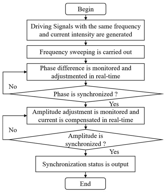 Based on the above motion model and simulation results, the procedure of the motion synchronization experiment of the two electromagnetic MEMS mirrors is shown in Figure 12. At first, two driving signals with the same frequency and current intensity generated by the Direct Digital Synthesizer (DDS) are used to activate the MEMS mirrors. Secondly, the frequency of the driving signal is progressively decreased from a higher to a lower value, thereby achieving a frequency sweep. Thirdly, the feedback control system monitors the phase difference between the two MEMS mirrors in real time, continuously adjusting the phases of the driving signals to reduce the phase difference. Fourthly, a judgment is made on whether the phases of the two electromagnetic MEMS mirrors are synchronized. Next, the amplitude difference between the two MEMS mirrors is monitored in real time, and the current is continuously adjusted to compensate for it. Then, a judgment is made again on whether the amplitudes of the two electromagnetic MEMS mirrors are synchronized. Finally, the synchronization status of the two electromagnetic MEMS mirrors is output.