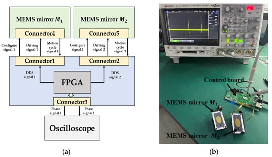 In the synchronization process of the electromagnetic MEMS mirrors, the MEMS mirror modules are connected to the main control board. After power is applied, the FPGA on the motherboard generates driving signals based on the Direct Digital Synthesizer and then outputs the driving signals to the MEMS mirrors. A frequency sweep is carried out from 250 Hz to 220 Hz. The MEMS mirror modules provide the motion cycle signals of the electromagnetic MEMS mirrors to the FPGA to detect the phase difference between the two MEMS mirrors. During the frequency sweep, the phase difference between the MEMS mirrors is gradually reduced by adjusting the phase of the DDS driving signal. The phase adjustment is continuous throughout the entire frequency sweep process, and the phase synchronization error must ultimately be controlled within the allowable range. After the frequency sweep is completed, the current intensity of the driving signal is adjusted in real time to achieve amplitude synchronization of the MEMS mirrors. Finally, the synchronization is completed, both MEMS mirrors have an optical scanning angle of 60°, a vibration frequency of 220 Hz, and a phase synchronization error within 2.8 µs, which meets the phase synchronization error requirement of 0.2° angular resolution. The entire synchronization process is completed within 10 s. The control system and experimental setup are shown in Figure 13.