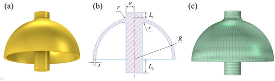 This paper analyzes the impact of the “” hemispherical resonator’s geometric parameters on its thermoelastic damping and resonance frequency, addressing a thermodynamic coupling problem. Therefore, a finite element simulation model of the hemispherical resonator was developed using the multi-physics coupling software, COMSOL Multiphysics 6.0, in the Solid Mechanics and Heat Transfer in Solids modules. A schematic representation of the hemispherical resonator’s structure is shown in Figure 1a,b.