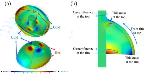 Under the operating mode of four-wave belly vibration, the hemispherical shell periodically experiences tension and compression. The temperature of the regions subjected to compressive stress increases, while the temperature of those under tensile stress decreases. The temperature field changes, resulting due to these stresses, are illustrated in Figure 2a. At this moment, the temperature gradient is maximized along the lip of the hemispherical shell and the central rod, particularly at the rounded corners where they connect. Heat flows from the high-temperature region to the low-temperature region, resulting in irreversible heat loss of the vibration energy of the hemispherical resonator. This energy loss is referred to as thermoelastic damping loss. There are five primary paths of heat flow resulting from the temperature gradient, as illustrated in Figure 2b.