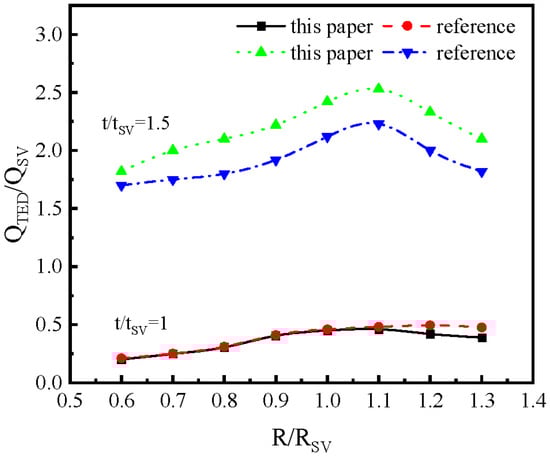 Additionally, referencing the research model from the literature [18], this paper’s simulation model is utilized to calculate the influence of the midplane radius and shell thickness of the hemispherical resonator on QTED, and to compare these results. As shown in Figure 4, the horizontal axis represents the rate of change in the actual midplane radius of the resonator relative to its standard value, while the vertical axis denotes the rate of change in the actual thermoelastic damping factor QTED of the resonator relative to the standard parameter QTED. The results indicate that the findings of this paper align closely with those in the literature. Therefore, it can be concluded that the simulation model presented in this paper is reliable.