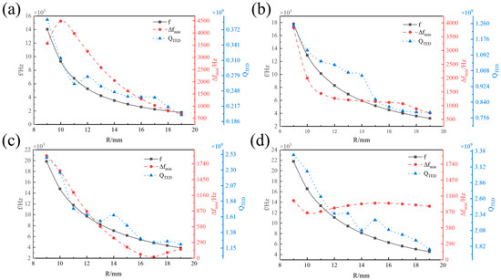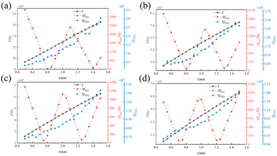 Influence of t on f, ∆fmin, and QTED. (a) R = 10 mm. (b) R = 14 mm. (c) R = 16 mm. (d) R = 18 mm.