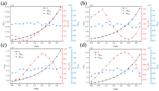 Influence of r on f, ∆fmin, and QTED. (a) a = 2.5 mm. (b) a = 3 mm. (c) a = 4 mm. (d) a = 5 mm.