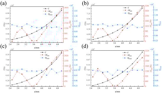 Influence of a on f, ∆fmin, and QTED. (a) r = 1.6 mm. (b) r = 2 mm. (c) r = 2.4 mm. (d) r = 2.8 mm.