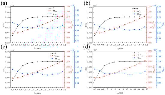 Influence of L1 on f, ∆fmin, and QTED. (a) L2 = 3 mm. (b) L2 = 5 mm. (c) L2 = 8 mm. (d) L2 = 10 mm.