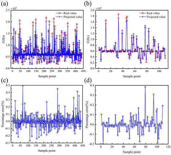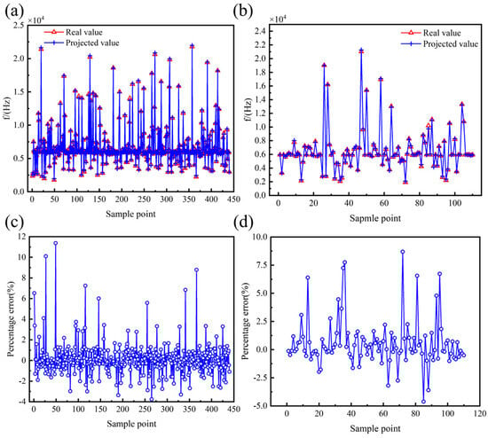 Effect of multivariate nonlinear regression model of f. (a) Comparison of true and predicted values of training set. (b) Comparison of true and predicted values for testing set. (c) Percentage error between true and predicted values of training set. (d) Percentage error between true and predicted values of testing set.