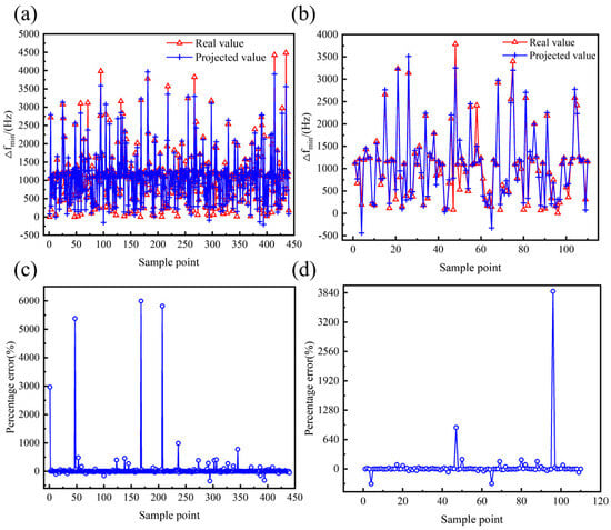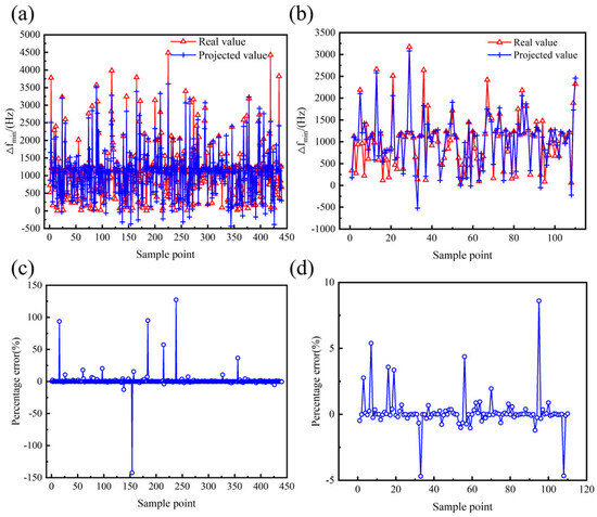 Effect of multivariate nonlinear regression model of ∆fmin. (a) Comparison of true and predicted values of training set. (b) Comparison of true and predicted values for testing set. (c) Percentage error between true and predicted values of training set. (d) Percentage error between true and predicted values of testing set.