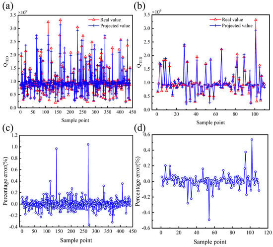 Effectiveness of PSO-BP prediction model of QTED. (a) Comparison of true and predicted values of the training set. (b) Comparison of true and predicted values for the testing set. (c) Percentage error between true and predicted values of the training set. (d) Percentage error between true and predicted values of the testing set.