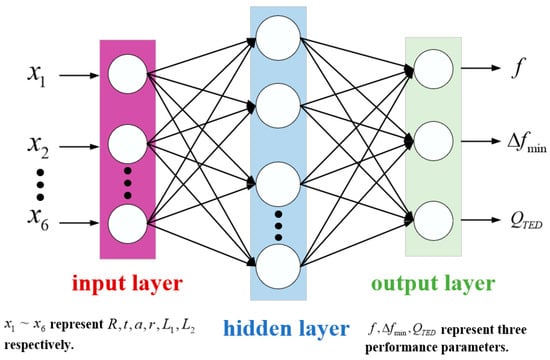 (1) Data Preprocessing: A sample set is constructed from the simulation data derived from the finite element model. The input dimension consists of six parameters: midplane radius R, spherical shell thickness t, centre rod radius a, inner and outer fillet radii r, centre rod clamping end length L1, and centre rod fixed end length L2. Each output includes operating frequency f, minimum frequency difference from the interference modes ∆fmin, and thermoelastic damping QTED. A total of 550 data sets were collected, with 80% allocated to the training set and the remaining 20% to the test set. The input and output matrices are represented in the following equations: