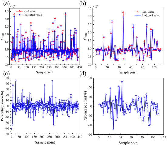 Effect of multivariate nonlinear regression model of QTED. (a) Comparison of true and predicted values of training set. (b) Comparison of true and predicted values for testing set. (c) Percentage error between true and predicted values of training set. (d) Percentage error between true and predicted values of testing set.