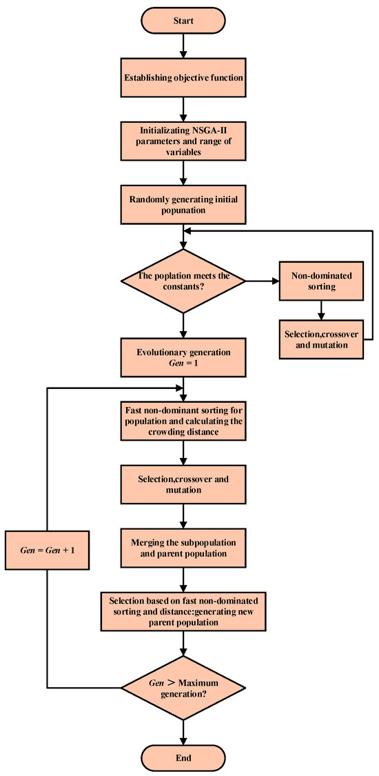 The flow of the NSGA-II algorithm is illustrated in Figure 19. The specific operations are as follows: