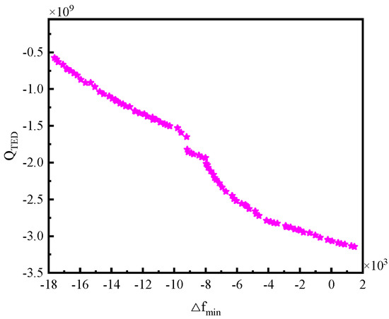 To improve the model fitting accuracy, the structural parameters and performance parameters were analyzed using multivariate nonlinear regression based on the least squares method. After several tests, a 6th full-order polynomial was selected as the multivariate nonlinear regression model, which includes all terms from the 1st to the 6th order of the independent variables, as well as all possible interaction terms. The analysis results of the multivariate nonlinear regression model are presented in Table 6 and Figure 10, Figure 11 and Figure 12. The goodness of fit R2 of the multivariate nonlinear regression model for f and QTED is greater than 0.97, indicating an excellent fit and making the model suitable for data prediction. Although the goodness of fit for the multivariate nonlinear regression model concerning ∆fmin has significantly improved, it remains below 0.9. Therefore, it is necessary to explore additional models to enhance fitting accuracy.
