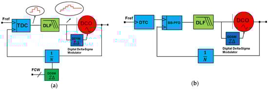 Meanwhile, the other SDM is used to dither MMD to synthesize fractional division for fractional-N operation. As this architecture necessitates the usage of a wide range of TDC and SDMs, power scaling toward the sub-milli watts regime is difficult to achieve. Nevertheless, there are some low-power implementations with narrow-range TDC with phase prediction. In the case of BB-ADPLLs, achieving high performance requires high power. Figure 2b shows BB-ADPLL, which requires MMD in its feedback path. The divided clock will be used for phase comparison by bang-bang PFD to phase error. The PFD output will go through DLF to produce a filtered version of the phase error constituting the OTW. The OTW will drive the DCO toward the target as there is a closed-loop system if sufficient stability criteria are met. Reference [10] implemented BB-ADPLL capable of synthesizing fractional-N frequency with the DTC assistance.