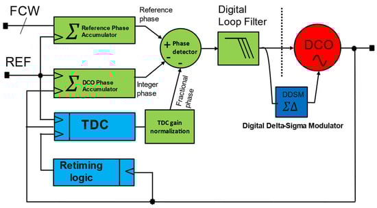 - Chen, M.S.-W.; Su, D.; Mehta, S. A Calibration-Free 800 MHz Fractional-N Digital PLL with Embedded TDC. IEEE J. Solid-State Circuits 2010, 45, 2819–2827. [Google Scholar] [CrossRef]