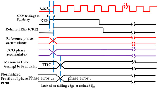In some implementations, TDC is embedded into the DCO to save power and relax the TDC gain calibration requirement. An injection-locked ring-oscillator-based TDC is used in [34], which also complements the relaxation of TDC calibration, while some use embedded TDC-based ADPLL [11]. A typical accumulator-based ADPLL is shown in Figure 5. It uses a reference phase accumulator and a DCO phase accumulator. In a multi-clock domain digital system, all-digital sub-systems must be synchronized or operated in a master clock [6]. This is necessary to meet timing requirements and avoid metastability. Figure 6 shows the timing diagram [32] of the accumulator-based ADPLL. As shown in Figure 6, the DCO clock, which is also referred to as CKV, retimed reference (CKR) clock, and REF clock. The CKR (retimed) clock is used as the master clock for synchronization. TDC estimates the fractional phase between the DCO clock and the REF clock. The reference phase accumulator accumulates frequency command words (FCW) at every reference cycle, constituting the accumulating integer reference phase values. The TDC computes the time difference between the DCO edge and reference to compute the fractional phase error. The TDC works directly on the DCO clock, which leads to substantial power requirements. On the other hand, the DCO accumulator accumulates the DCO phase on every DCO cycle. However, to align the rates at which the phase quantities are compared, the DCO phase accumulator is sampled at the reference cycle, which is then compared by the phase detector to produce steady-state phase error. The computed steady phase error is going through DLF to produce a filtered version of OTW. In the closed loop operation, DLF can switch the ADPLL into type-II mode due to an additional digital integrator inside DLF. In addition to proportional and integral gain, DLF can also equipped with an infinite impulse response (IIR) filter to place higher-order poles to suppress the reference spur. The OTW, then drives the DCO towards the target after all it is negative feedback. The frequency of CKV can be given by the following expression.