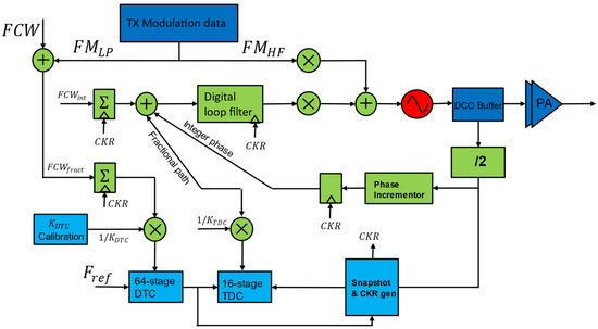 - Chillara, V.K.; Liu, Y.-H.; Wang, B.; Ba, A.; Vidojkovic, M.; Philips, K.; de Groot, H.; Staszewski, R.B. 9.8 An 860µW 2.1-to-2.7GHz all-digital PLL-based frequency modulator with a DTC-assisted snapshot TDC for WPAN (Bluetooth Smart and ZigBee) applications. In Proceedings of the 2014 IEEE International Solid-State Circuits Conference Digest of Technical Papers (ISSCC), San Francisco, CA, USA, 9–13 February 2014; pp. 172–173. [Google Scholar] [CrossRef]