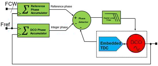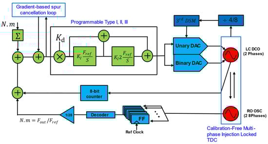 - Seong, T.; Lee, Y.; Yoo, S.; Choi, J. A −242dB FOM and −75dBc-reference-spur ring-DCO-based all-digital PLL using a fast phase-error correction technique and a low-power optimal-threshold TDC. In Proceedings of the 2018 IEEE International Solid—State Circuits Conference—(ISSCC), San Francisco, CA, USA, 11–15 February 2018; pp. 396–398. [Google Scholar] [CrossRef]