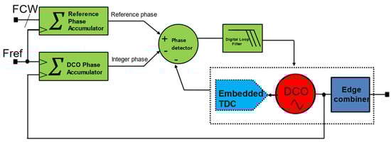 Embedded TDC-based ADPLL can be realized in two ways. One way is to concurrently use the multiphase nature of multi-stage RO-based DCO as TDC and DCO. A simplified conceptual schematic diagram is shown in Figure 8.
