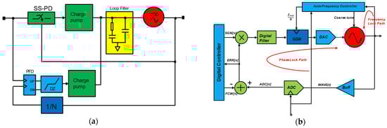 Whereas sub-sampling PLLs perform the divider-less operation by sampling oscillators directly by a sampling phase detector at the reference frequency. Due to the high gain nature of the sampling phase detection process, ideally, zero crossings of oscillator and reference should align, achieving frequency multiplication by N (target frequency ratio). The divider-less architecture removes the power consumption of the divider and N2 noise contribution [36]. The sub-sampling PLLs can be implemented in classical analog, as shown in Figure 11a, and one of the all-digital sub-sampling PLLs (SS-ADPLL) reported in [37] is shown in Figure 11b.