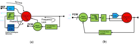 Injection locking is another divider-less low-power technique to realize low-power synthesizers. In this class of ADPLLs, hardly any analog component except DCO is used directly inside the PLL. All state machines and control circuits are realized digitally; hence, it can be categorized as an all-digital implementation. One of the examples in this category is low-power all-digital frequency-locked loop (ADFLL) synthesizer for LO generation for RF receivers. A DCO or VCO can be injection-locked to an integer multiple of reference frequency when the DCO is tuned to be very close to the target frequency within a few KHz accuracy. A sophisticated digital algorithm can be implemented to lock the DCO to the reference by continuously tracking the DCO frequency in the event the DCO goes out of lock or out of target. Figure 12a,b show examples of injection-locking FLLs [30]. One uses DCO directly, and the other uses VCO in conjunction with DAC, which effectively forms the DCO.