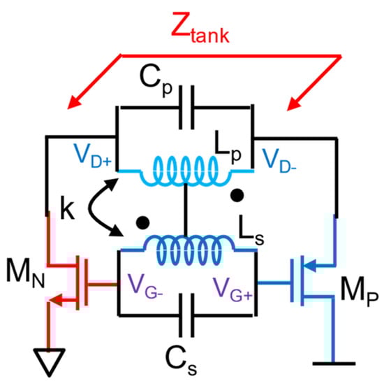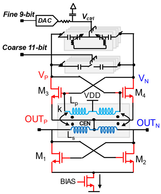 Conventional class-F oscillators require complex 2D capacitor tuning for harmonic alignment, which is challenging to automate and prone to PVT variations. The class-F−1 DCO eliminates this by leveraging the transformer tank’s natural harmonic alignment; i.e., the fundamental frequency and 2nd-harmonic frequency of the oscillator are aligned, which can effectively suppress the noise contribution from the negative transistors. According to [12], and can be expressed as