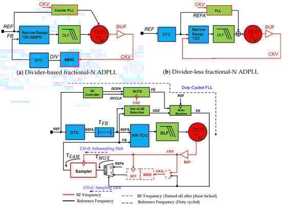 In general, divider-based ADPLLs samples directly and compare the divided DCO clock (CKV) at every reference cycle with the help of TDC. Because of this sampling and comparison operation, this ADPLL can also be called a sampling PLL. Here, the phase comparison is done by TDC, which consumes much power due to the range and linearity requirement. A DTC can shrink the required TDC range to lower power consumption. There are several reported low-power ADPLLs in this category. However, the feedback MMD divider introduces quantization noise in the loop and limits the in-band noise. Because TDC noise is multiplied by N2 [35] due to the feedback being divided by N, this ADPLL offers multiple benefits, such as an extensive tuning range, PVT robustness, and fractional-N operation.