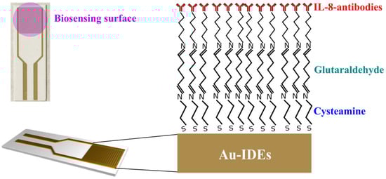 The biosensing surface (interdigitated electrodes area denoted in Figure 1) was functionalized through a series of incubation and washing steps described in previous works [28,31,32]. Initially, the surface was incubated in a 1 mM ethanolic solution of cysteamine at 25 °C for 1 h in the dark. Following this, the electrode was rinsed with ethanol and dried using nitrogen. Subsequently, 50 µL of 2.5% glutaraldehyde in PBS was applied to the surface and incubated for 1 h, after which it was rinsed with deionized (DI) water and dried with nitrogen. For IL-8 antibody immobilization, 50 µL of a 1 µg/mL IL-8 antibodies solution in DI water was introduced and incubated for 1 h, followed by rinsing with DI water. Finally, surface blocking was performed by incubating the electrode with 50 µL of 5% bovine serum albumin (BSA) in PBS for 30 min. The biosensing surface was then washed with DI water and dried with nitrogen, preparing it for IL-8 antigen detection. The immobilization of these layers was confirmed in a previous work by different characterization methods [28,31,32]. Figure 1 illustrates the IL-8 antibody immobilization strategy employed in this work.