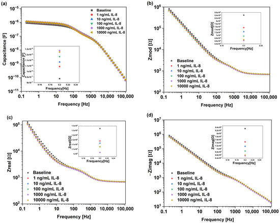Bode plots of gold Au-IDE-based non-Faradaic impedimetric biosensors analyzed for IL-8 antigen detection, presenting data for (a) capacitance, (b) Zmod, (c) Zreal, and (d) Zimag.